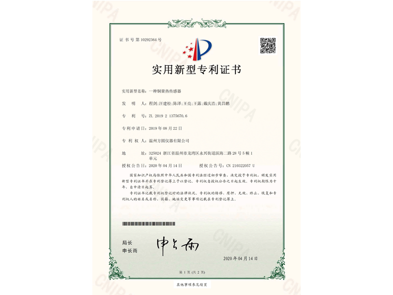 中國實用新型專利:一種銅量熱傳感器(ZL 2019 2 1375670.6)