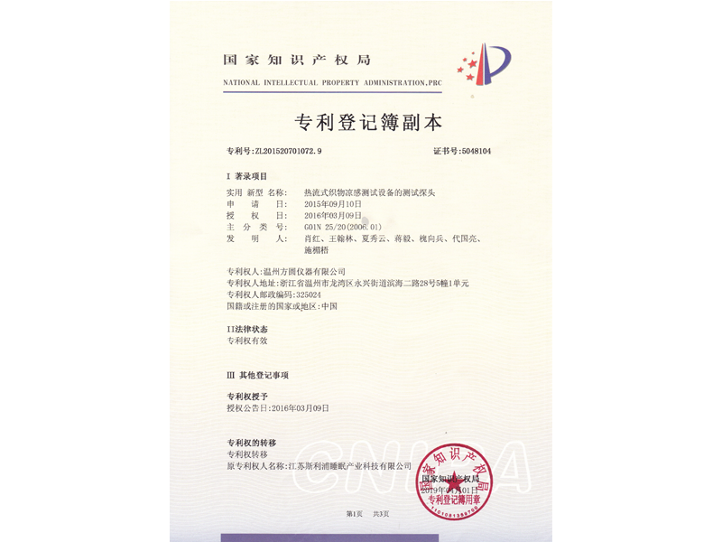 中國發(fā)明專利:熱流式織物涼感測試設(shè)備及測試方法(ZL 2015 1 0574661.X)