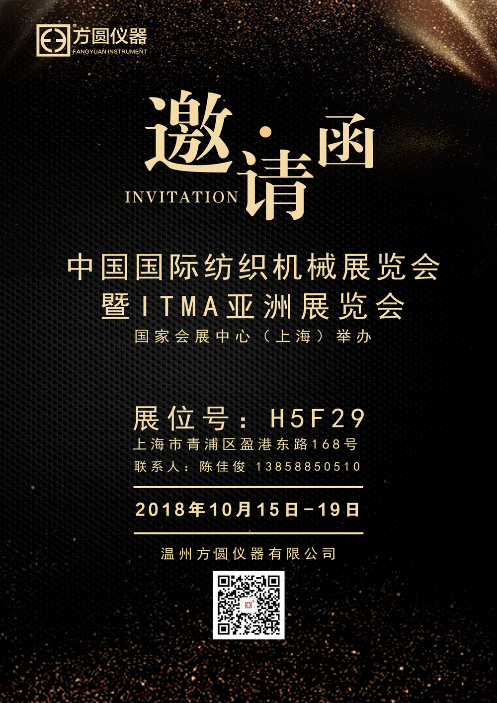 2018年中國國際紡織機(jī)械展覽會暨ITMA亞洲展覽會將于2018年10月15日-19日在國家會展中心(上海)舉辦,熱忱歡迎各位紡織人士蒞臨指導(dǎo),共話紡織未來。展位號:H5F29; 地址:上海市青浦區(qū)盈港東路168號;聯(lián)系人:陳佳?。?3858850510)