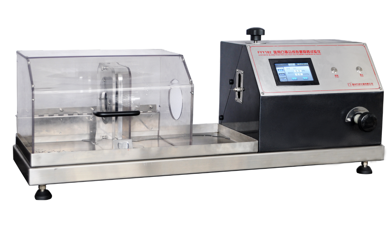 FYY182口罩合成血液穿透試驗儀將醫(yī)用口罩支撐在試驗裝置上,以一定體積的合成血液水平噴射到口罩上,模擬口罩被穿透后血液噴濺的場景。使之與醫(yī)學活動過程保持一致。從而觀察口罩的穿透情況來評價口罩抗合成血液穿透性。