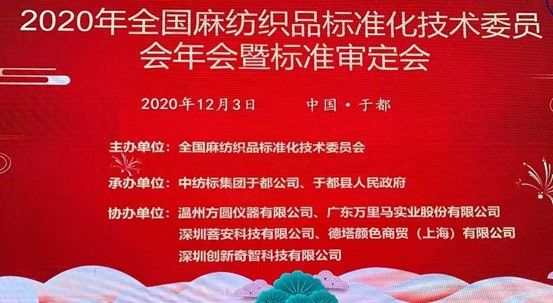 2020123, 全國麻紡織品標(biāo)準(zhǔn)化技術(shù)委員會第四屆第四次委員代表大會在江西·于都順利召開。本屆大會由全國麻紡織品標(biāo)準(zhǔn)化技術(shù)委員會主辦,中紡標(biāo)集團于都公司、于都縣人民政府承辦,溫州方圓儀器有限公司、廣東萬里馬實業(yè)股份有限公司、深圳菩安科技有限公司、德塔顏色商貿(mào)(上海)有限公司、深圳創(chuàng)新奇智科技有限公司協(xié)辦。